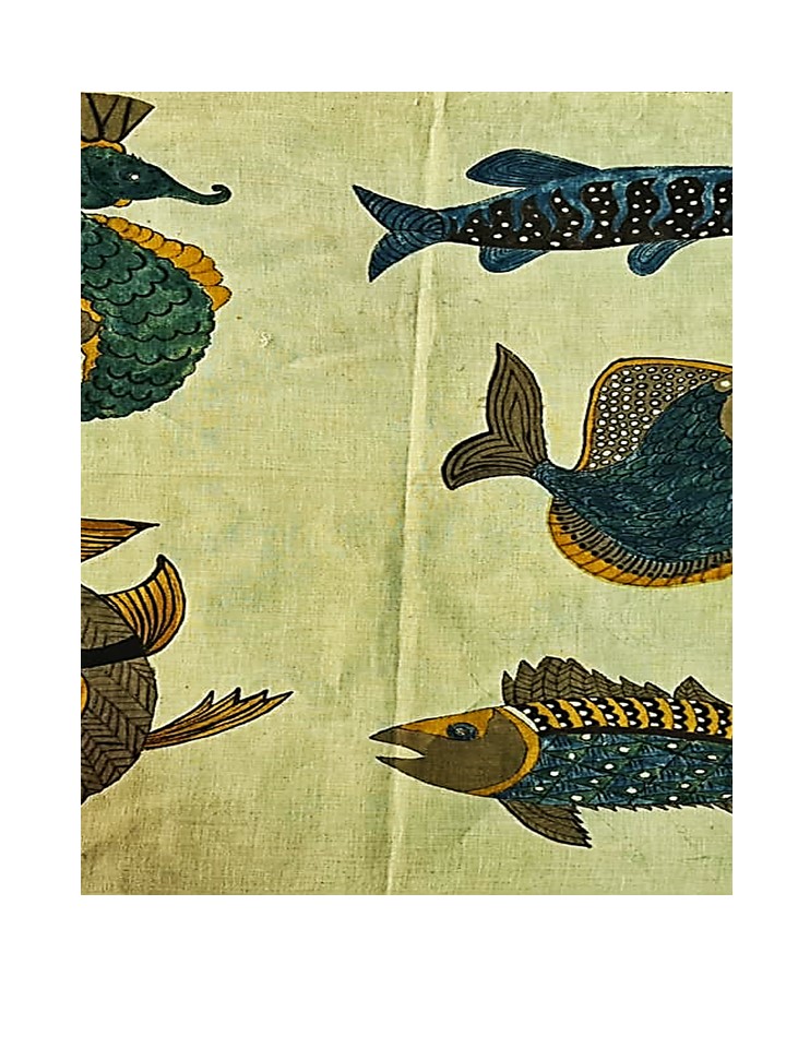 A 60 m long ocean was painted with wax and dyed in a huge Indigo natural Vat repeatedly to achieve four shades of blue, on this, the fishes were appliqued by Susie.